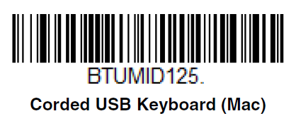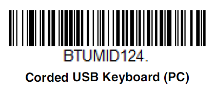 Scan one of the following barcodes to program the corded scanner for a USB keyboard (either PC or Macintosh), then power-cycle the host.