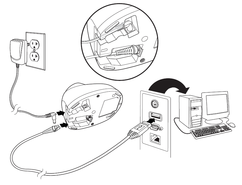 Use the diagram below to connect the scanner base unit to the power supply and the computer USB port.