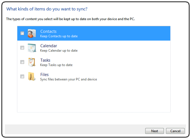 3. Click Set up your device. The What kind of items do you want to sync? pop-up appears.