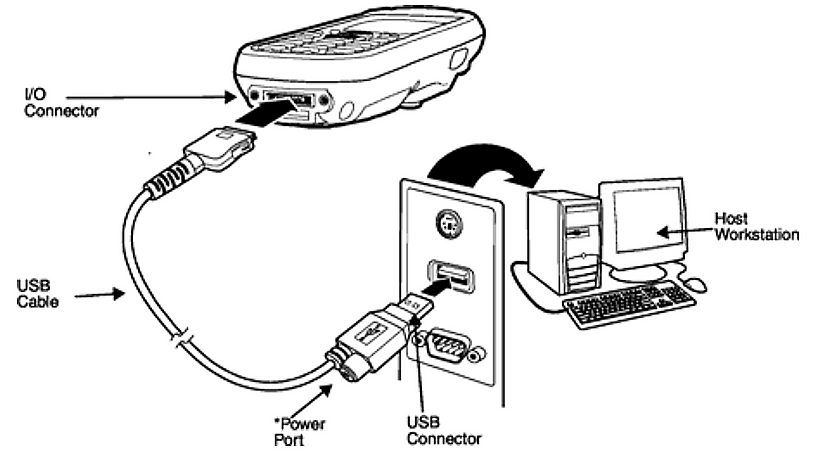 I/O connector (wired communication): The mechanical connector on the bottom panel lets you connect the Panther to a host workstation through a USB (1.1 or higher) connection using ActiveSync communication.