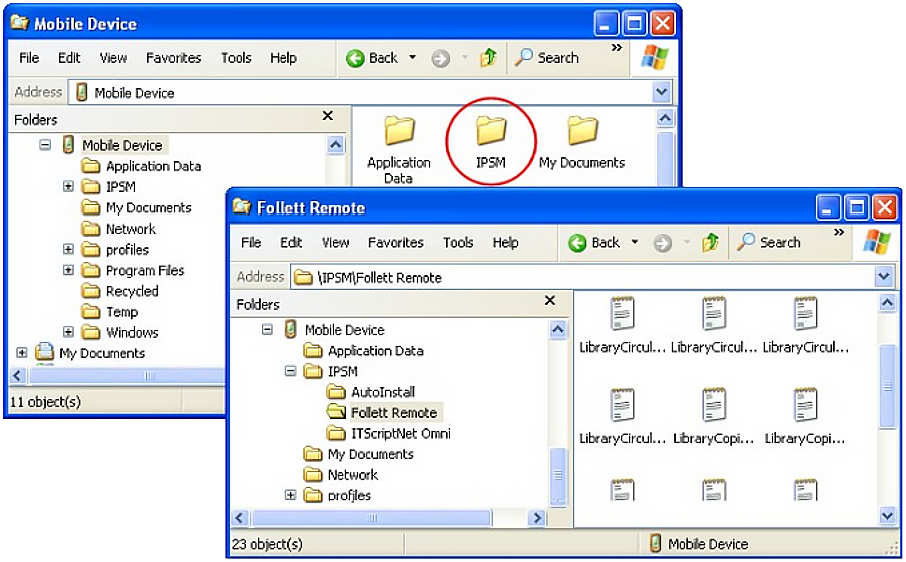 2. Locate and transfer your Follett Remote files by dragging and dropping—or copying and pasting—them to a location on your workstation, just as you would when moving any files between folders. You will find your Follett Remote files in \IPSM\Follett Remote.