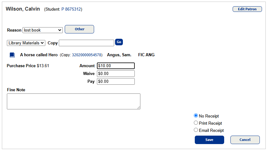 • Resource Manager/Textbook Manager: The fine amount for lost textbooks or resources is the replacement price or, if there is no replacement price in the title or resource record, the item's purchase price. For overdue items, the check-in staff enters the amount; this is dependent on the selections made in Site Configuration ( Admin > Site Configuration > Circulation).