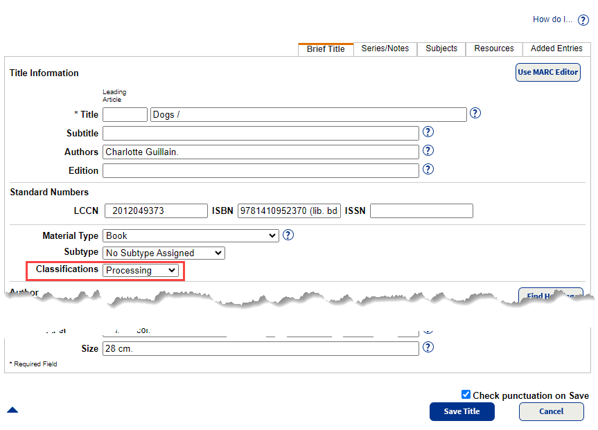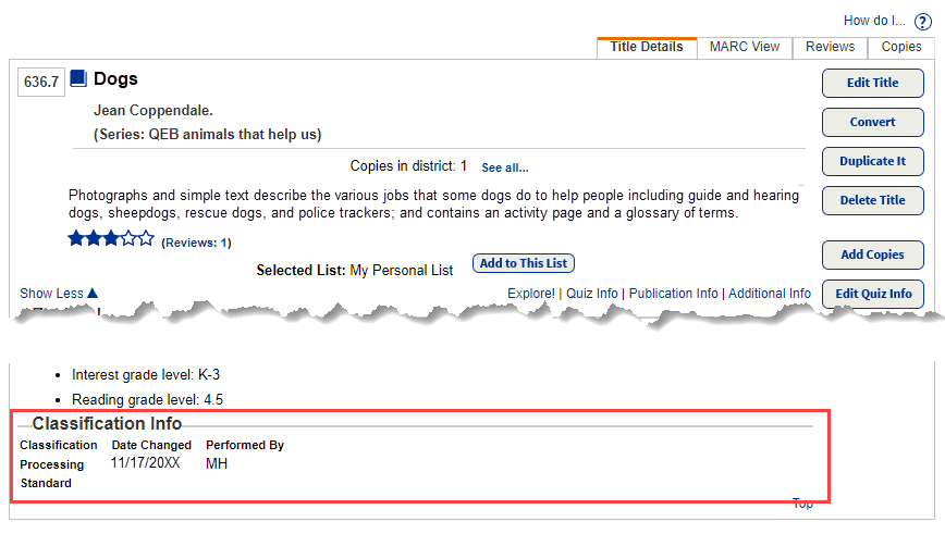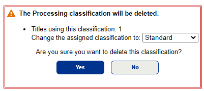Example: A district uses a title classification of "Processing" for books that are purchased, but not ready to be checked out by patrons.