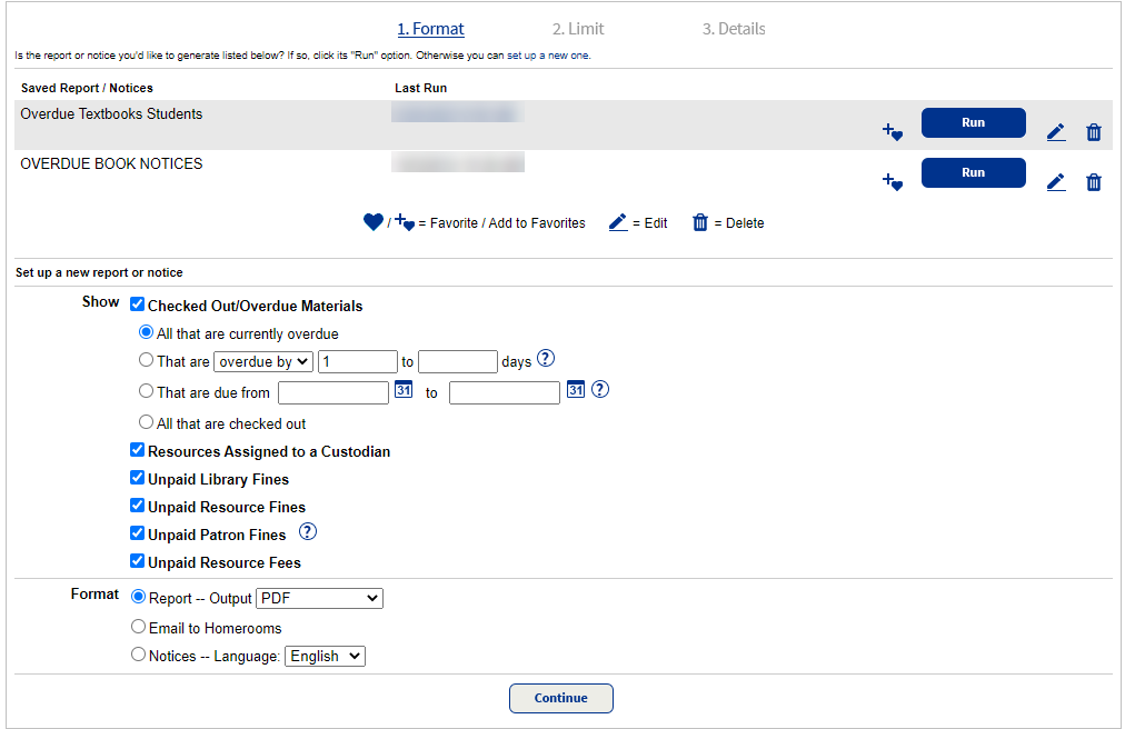 The Current Checkouts/Fines report helps you identify and send notices to students with checkouts, overdues, and/or fines. You can report information as broadly or as narrowly as you want.