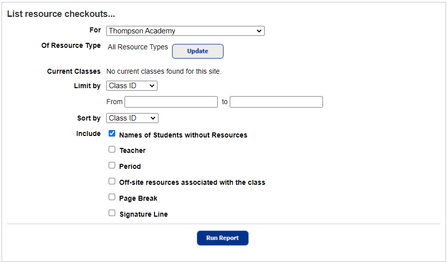 The Resource Checkout Summary report helps you determine the number and percentage of students who do not have the required resources and/or textbooks for their current classes. Destiny considers a student to be without resources and/or textbooks if they are missing at least one of the assigned items for a class.