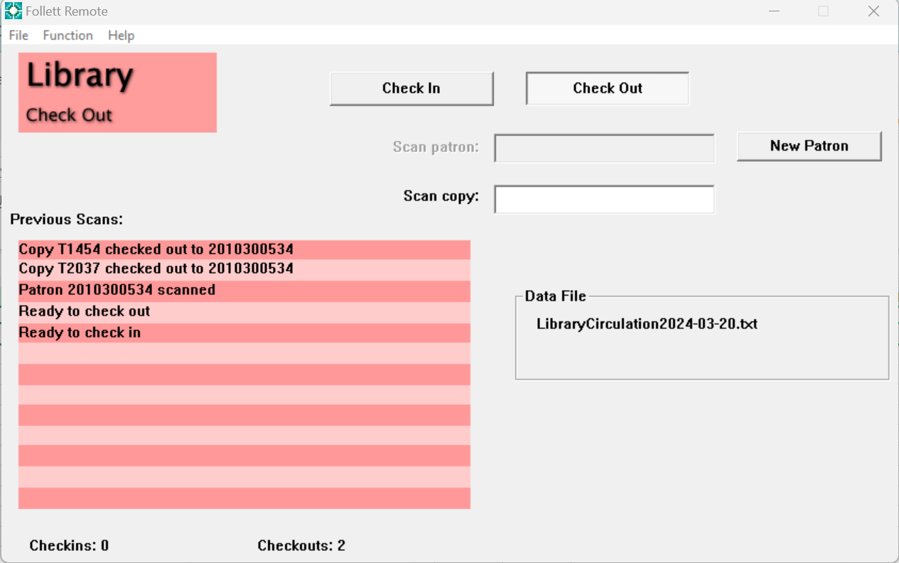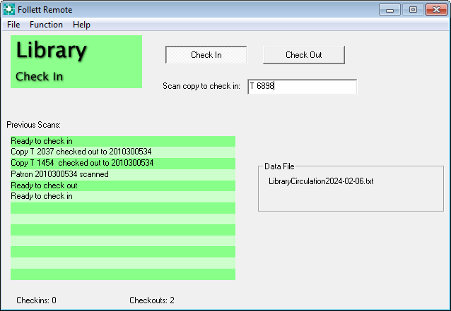 Remote circulation for library check out and check in can be done with a Follett scanning device that has Follett Remote installed.